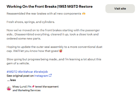 In my case, as I mentioned previously I use Instagram to document the restoration of a 1953 MG TD, a long-term restoration project I’ve been sharing over time. That account functions more like a visual project journal than a marketing channel. I have a board on my account called 1953 MG TD Restoration where these pins reside.