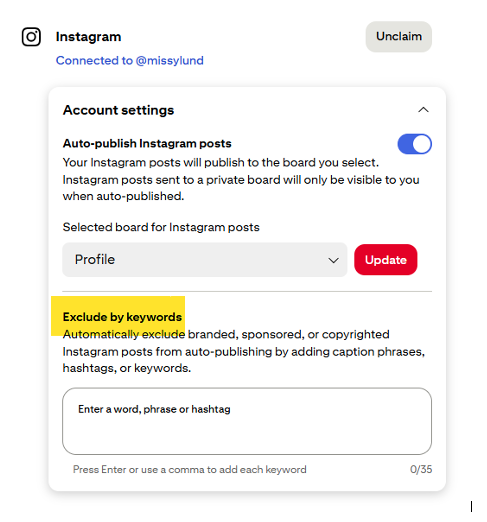 Note: Keyword filtering for auto-published Instagram posts currently must be configured from desktop, as the setting is not available in the mobile interface.