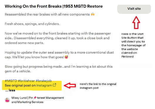 Pinterest also notes that when you have a claimed domain, clicking the Visit Site button will take users to your website instead of the Instagram post.